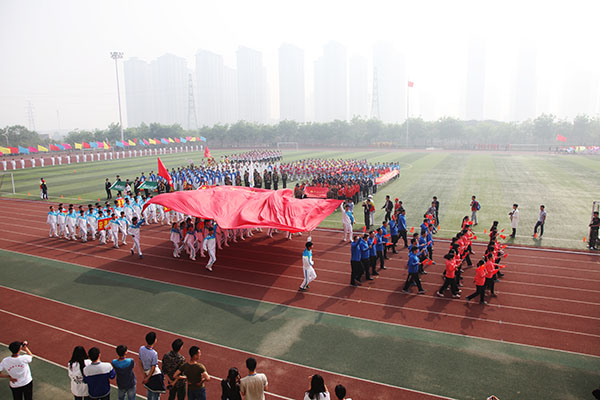 4月21日上午,我校阳光体育活动暨第32届田径运动会在两校区体育场同时盛大开幕。校领导石恒真、赵卫东、窦效民、尚宝平、安士伟、毛多斌、王新杰、李世瑛分别出席两校区运动会开幕式。开幕式分别由副校长毛多斌、王新杰主持。相关院系、部门负责人和6000余名师生参加了开幕式活动。