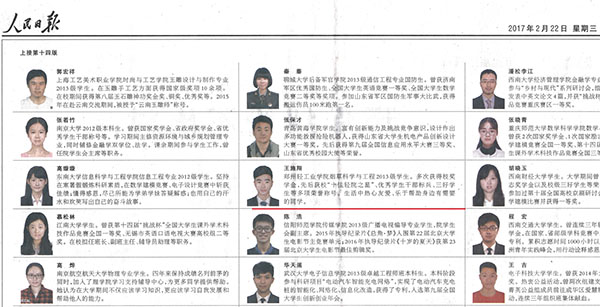 《人民日报》2月22日整版公布了《国家奖学金获奖学生代表名录》,我校食品与生物工程学院2013级王施翔同学入选。该名录经全国各高校推荐、专家评选,从5万名国家奖学金获得者中择优选出108人,河南省仅两名学生代表入选。