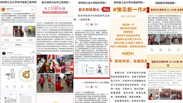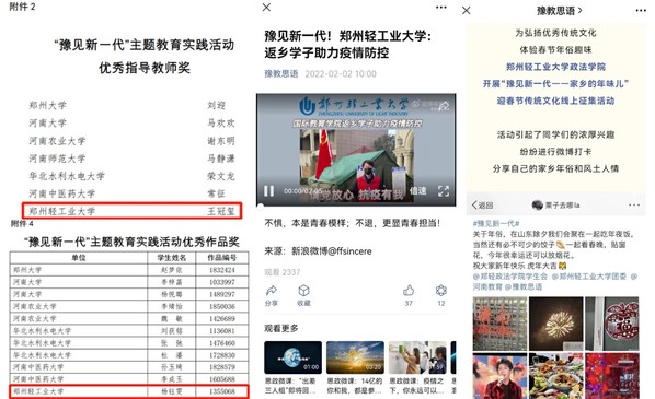 自活动开展以来,学校积极响应落实上级工作部署,全校各级团组织全面动员、积极配合,主动利用微信公众号、微博等新媒体矩阵进行广泛宣传,进一步深化育人与实践融合、线上与线下呼应的网络思政工作机制。本次活动以红色文化育人、社会实践育人等方式,通过腾讯微博积极参与#豫见新一代#话题讨论,引导青年学生紧紧围绕时代发展,进一步学习党的故事、革命的故事、英雄的故事,感受党的百年奋斗初心使命和人民群众幸福生活。活动开展期间,近万名轻工大青年学子在做好自身防护的同时,围绕“关爱老年人”“关爱青少年”“疫情防控”“迎春节·弘扬传统文化”“运动技能打卡”“四史学习”等主题教育实践活动,以“记录分享身边人身边事”的形式,正确认识、主动宣传、严格服从和积极服务于防疫抗疫大局,传承革命精神、孝老敬亲扶幼、弘扬传统文化、涵养家国情怀,共发表微博1万余篇,累计阅读量达到20万余次。其中,国际教育学院学生郑鹏飞的疫情防控先进事迹和政法学院学生孙业净、曹昕欣、马景娜的春节年俗趣味故事被河南省教育厅微信公众号“豫教思语”转载报道。