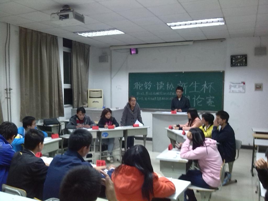 为了加强社团之间的交流与沟通,配合“社团潮”主题活动,读协与2013年11月7日晚于国教125与驼铃文学社共同举办了一场别开生面,精彩绝伦的“新生杯”辩论赛。活动于晚上七点半准时开始,第一场辩论赛围绕着“愚公应该移山还是搬家”这个辩题,双方辩友展开了剑拔弩张,针锋相对的辩论,最终由驼铃文学社派出的正方代表队更胜一筹取得胜利。第二场辩论会的主题是“当今社会更需要全才还是专才”双方代表,更是烽火狼烟,巾帼不让须眉!精彩的辩答迎来了一阵阵热烈的掌声。最终读协的反方代表队取得了胜利。最后读协会长和驼铃会长对这次活动做了评价与总结,在一片热烈的掌声中,辩论会落下了帷幕。通过这次辩论会,不仅仅加强了社团的成员间的交流,还增强了会员间社团间的合作意识。为协会的更好发展打下了基础!