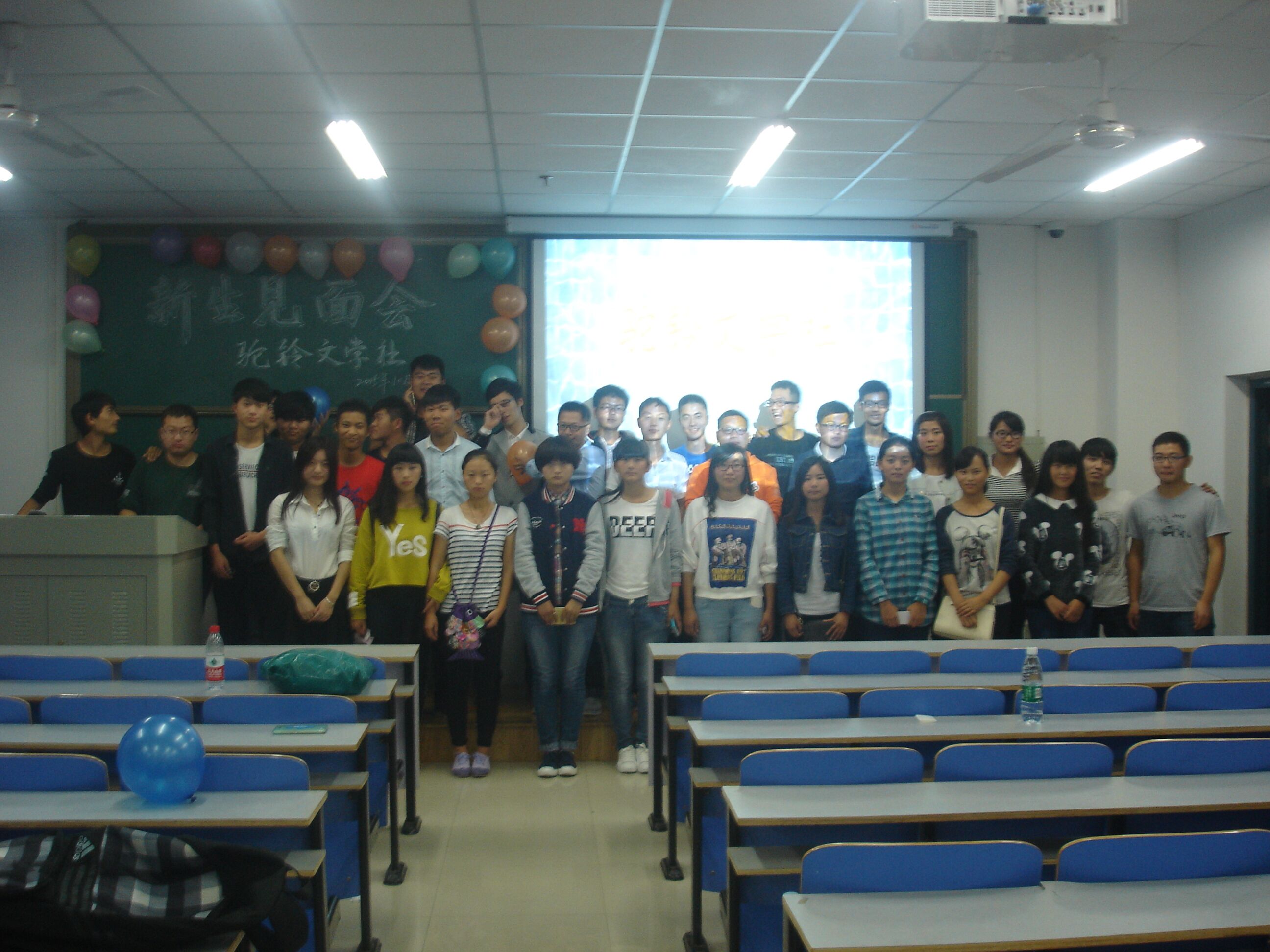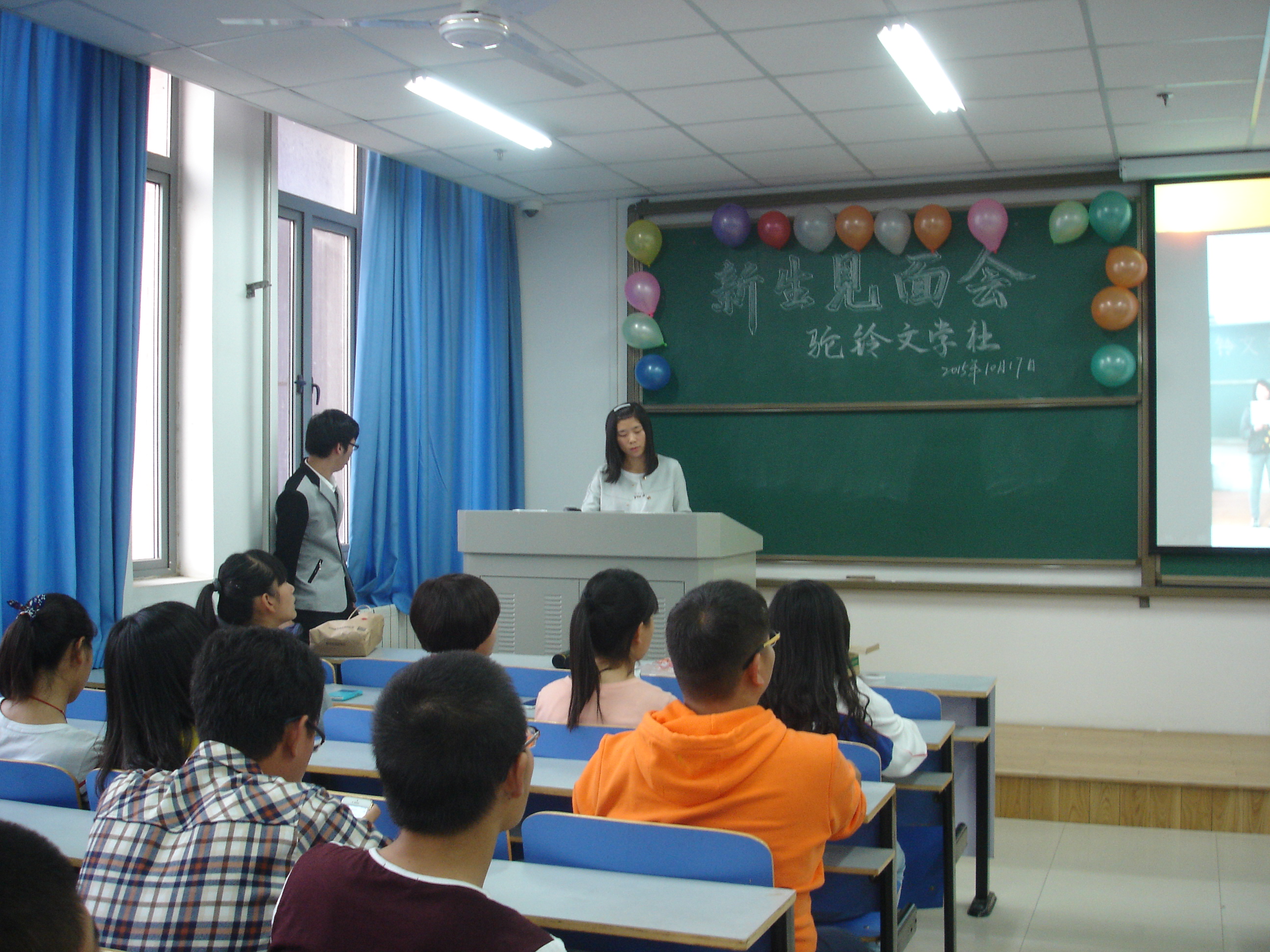 活动伊始,由驼铃文学社14级书记王晓阳代表发言,他陈述了在社团的感受并向大家介绍了社团的基本情况,包括组织架构、日常经典活动、报刊杂志以及一些对外交流平台,并解释了社团宗旨“独立之精神,自由之思想”的意义。接下来是各位14级部长及副部长的发言,他们除了自我介绍之外,还分别讲解了各部门的职责和未来的发展规划。部长的发言让各部会员大概了解了以后的学习方向,也给刚到大学的还在迷茫的驼铃人指明了道路。之后由14级会长蒋登科总结发言,他表示期待15级新生在以后的社团学习中能收获到对自己成长有利的文学精神,并能将驼铃精神一直传承下去。最后15级新生代表上讲台发言,全体驼铃人合影留念。至此,15级驼铃文学社新生见面会圆满结束。