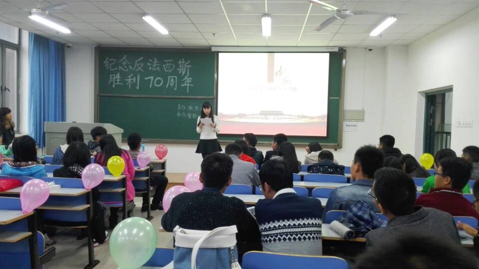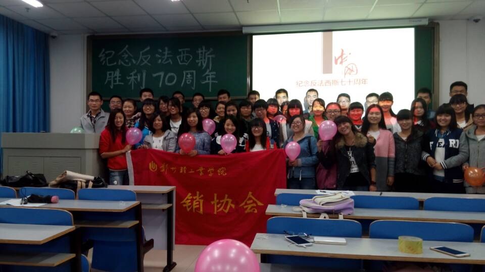 为纪念中国人民抗战胜利暨世界反法西斯胜利七十周年,传承和弘扬以爱国主义为核心的民族精神,进一步培育和践行社会主义核心价值观。11月5日下午,由校团委主办、营销协会承办的反法西斯战争胜利70周年纪念活动在郑州轻工业学院科学校区一教楼403室成功举行。此次会议由项目部部长石桐主持。营销协会全体成员参与了本次活动。