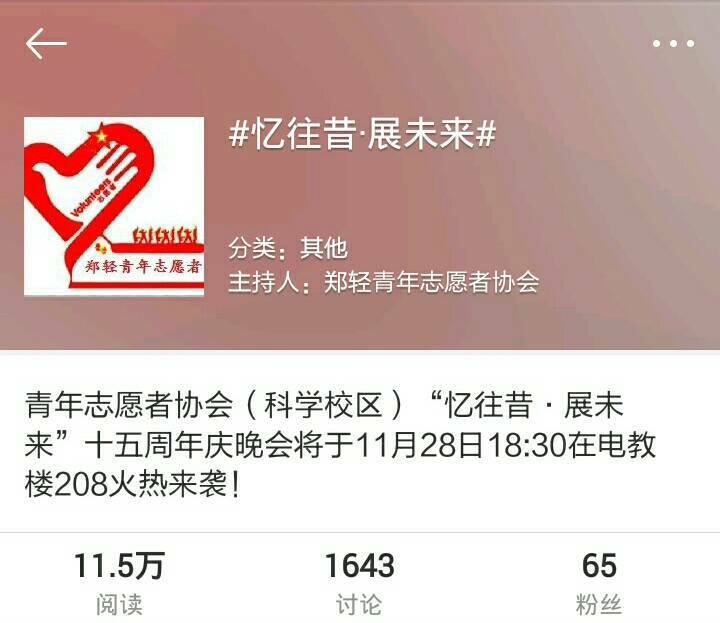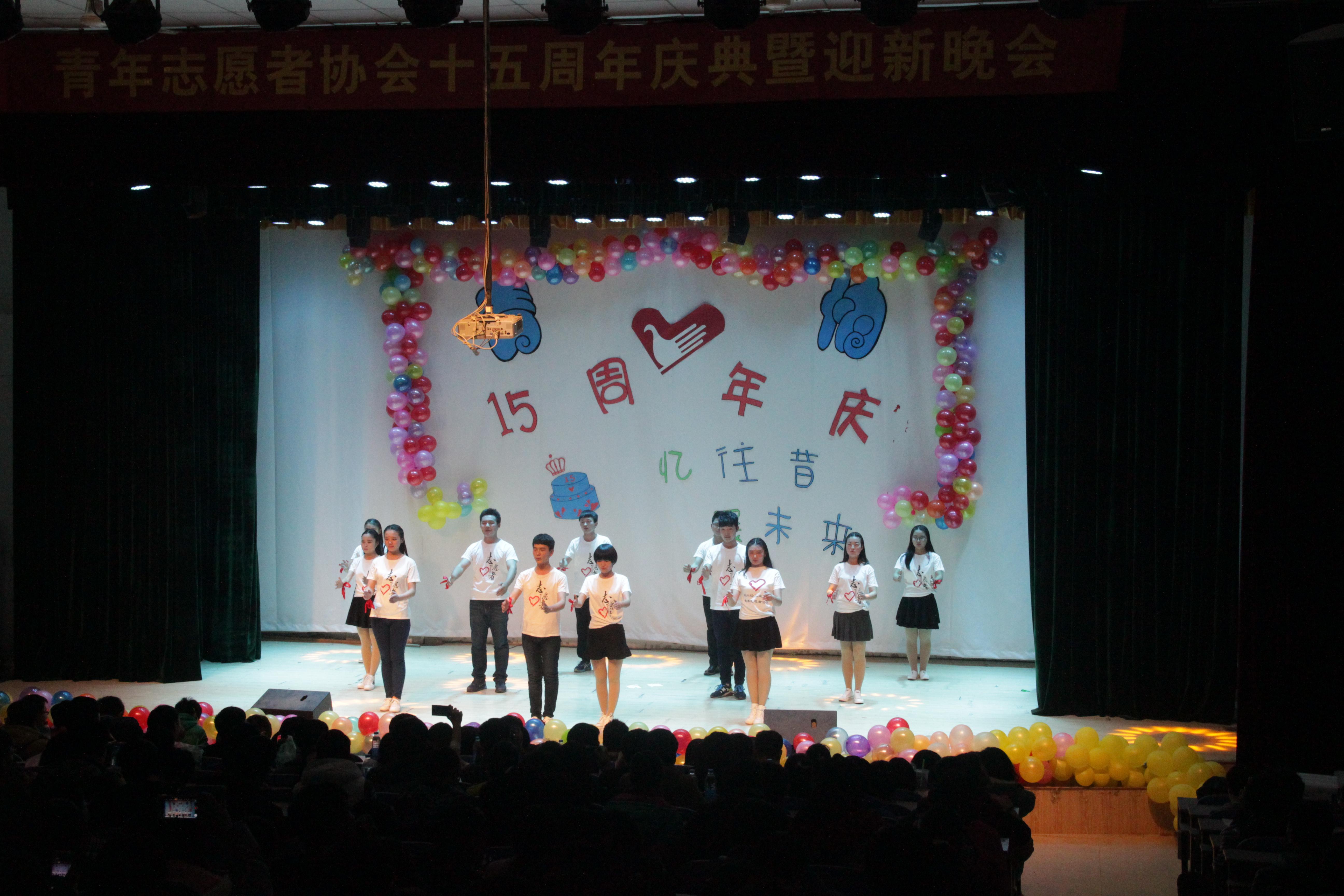 本次活动采用微博话题互动的形式,还未开始便获得了较大的关注,活动期间还伴有微博抽奖活动,阅读量达到11.5万人次,获得了较大的影响力。28日晚7点,晚会正式开始,第一项由主持人简单介绍青年志愿者协会的发展历程,并宣布晚会正式开始,随后依次介绍到场嘉宾。第二项由青年志愿者协会科学校区会长禹凯为此次十五周年庆典晚会致词,欢迎大家的到来,并感谢大家对青协的大力支持,为晚会的开始拉开序幕。第三项为各个部门的表演节目时间,晚会节目分为三个篇章。第一篇章为“忆往昔流年似水”,第二团总支全体理事带来的诗歌朗诵《张扬青春,与梦同飞》,牵动着在场所有观众的心,慷慨激昂的朗诵使得大家热血沸腾。第二篇章为“看今朝 风华正茂”,13级主席团带来的搞笑配音,将晚会的气氛推向了高潮。接着,文体部带来的手语表演《依然爱你》,优雅美丽的手语引起了全场的尖叫和热烈的掌声。第三篇章为“展未来意气风发”,各个部门的表演带动了现场的气氛,充分体现了青年志愿者协会各部门成员的凝聚力。除青协内部带来的精彩表演外,本次晚会还得到了河南工业大学青年志愿者服务团,交谊舞协会和武术协会的大力支持,他们分别带来了精彩的表演。晚会最后由全体副部合唱了会歌,伴随着优美又激励人心的歌声,本次青年志愿者协会十五周年庆典暨迎新晚会正式结束。
