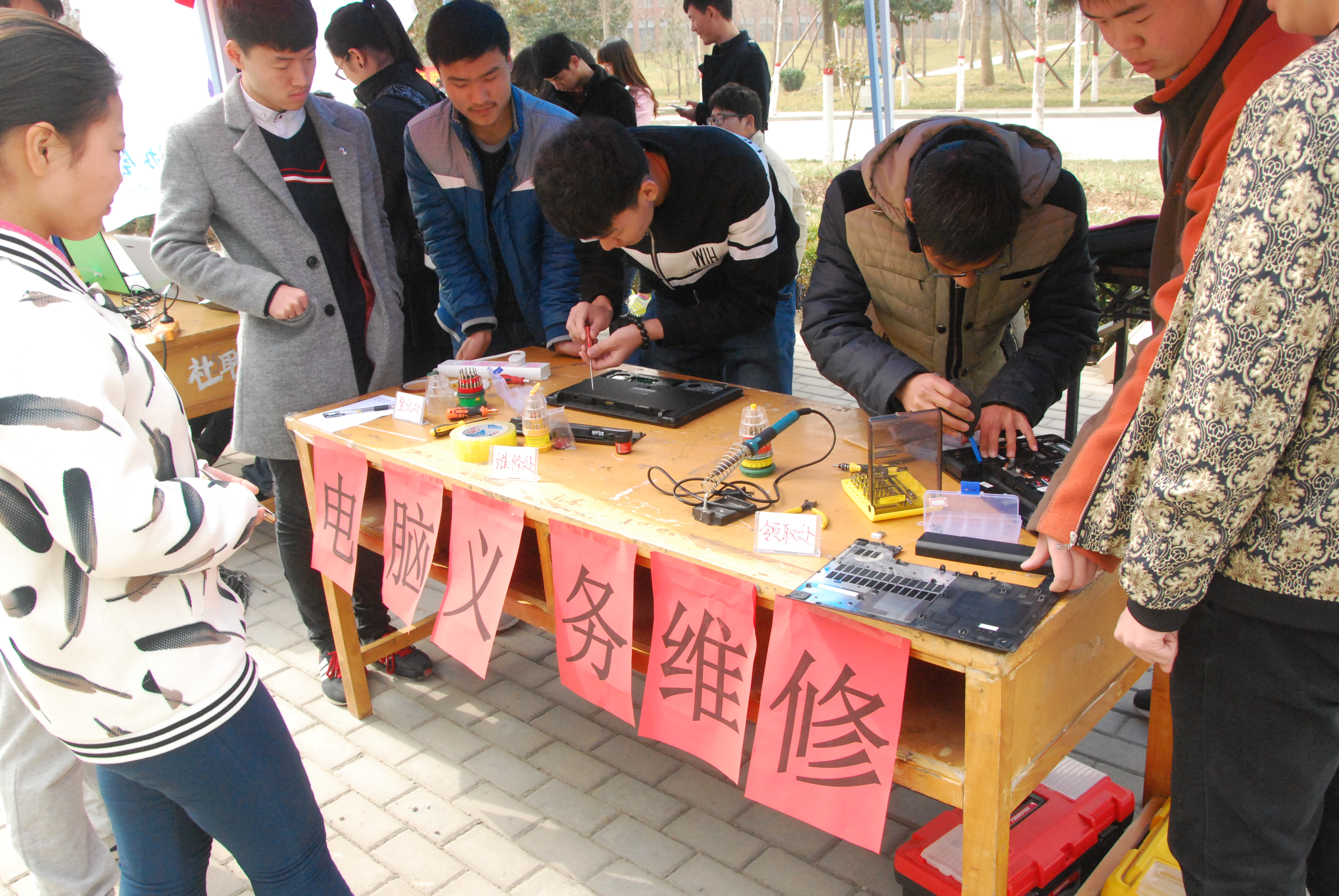 为深入贯彻党的十八届三中、四中、五中全会精神和团的十七届五中全会精神,大力弘扬雷锋精神,引导广大团员青年积极投身到建设和谐社会的伟大实践中来。3月5日,电子科技协会联谊计算机爱好者协会在清苑餐厅对面举行以“三月学雷锋”为主题的电脑义务维修,参加人员包括电子科技协会和计算机爱好者协会成员以及其他志愿者。