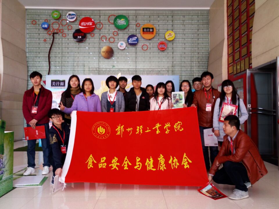 新学期,新气象,为了提高同学们的积极性,带领同学们走出校园,走进企业。2016年3月26日,由校团委主办、食品安全与健康协会承办的“走进可口可乐”活动在郑州太古可口可乐公司成功举行。参加此次活动的有食品安全与健康协会会长宋佳宁、14级各部长及所有15级成员。