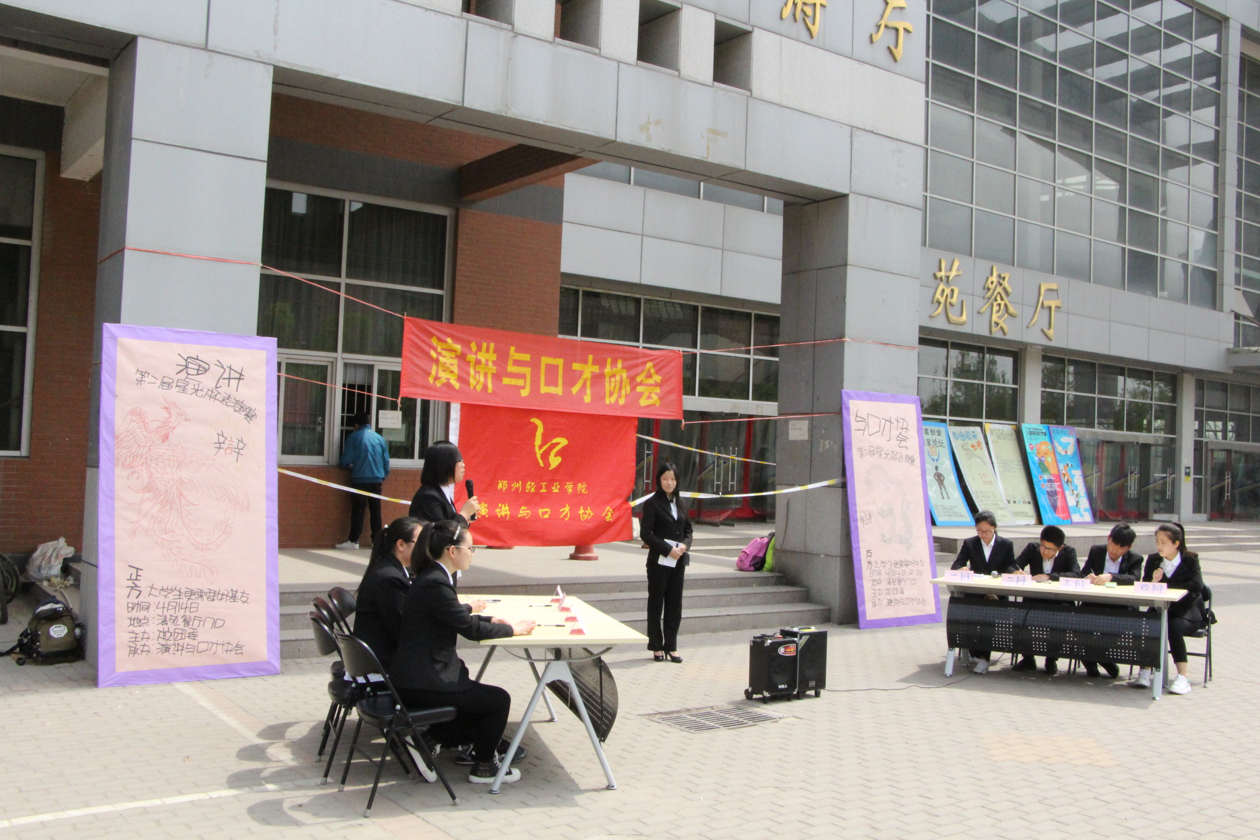 为促使更多同学们了解辩论,喜爱辩论,培养逻辑思维能力。4月14日下午,由校团委主办、演讲与口才协会承办的第二届星光杯辩论赛表演赛在科学校区清苑餐厅门前举行。演讲与口才协会副书记李楠担任本次比赛的主持人。