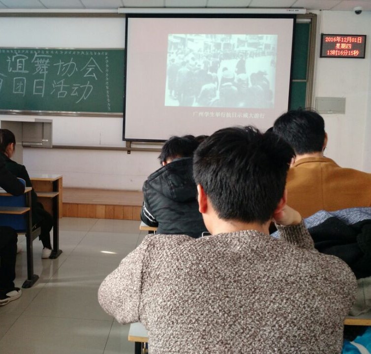 12月1日下午,由大学生社团联合会主办、交谊舞协会承办的“纪念一二·九运动”团日活动在科学校区二教楼708室开展。参加活动的人员有15级所有理事和16级所有协会成员。活动主持人由15级会长杨丹丹担任。