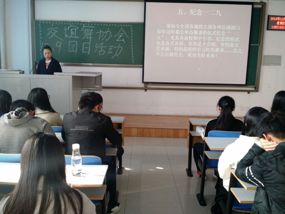 12月1日下午,由大学生社团联合会主办、交谊舞协会承办的“纪念一二·九运动”团日活动在科学校区二教楼708室开展。参加活动的人员有15级所有理事和16级所有协会成员。活动主持人由15级会长杨丹丹担任。
