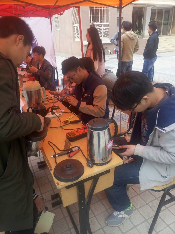 我们的会员们身体力行,热心帮助各位同学、老师维修电子产品,稍后,电气学院科创工作室和党员先锋队也积极参与进来!科创成员帮助我们维修,党工成员帮助我们登记信息,在我们合作下,修好了台灯、电扇、插座还有一个豆浆机,我们获得了很多感谢,维修现场热情洋溢。
