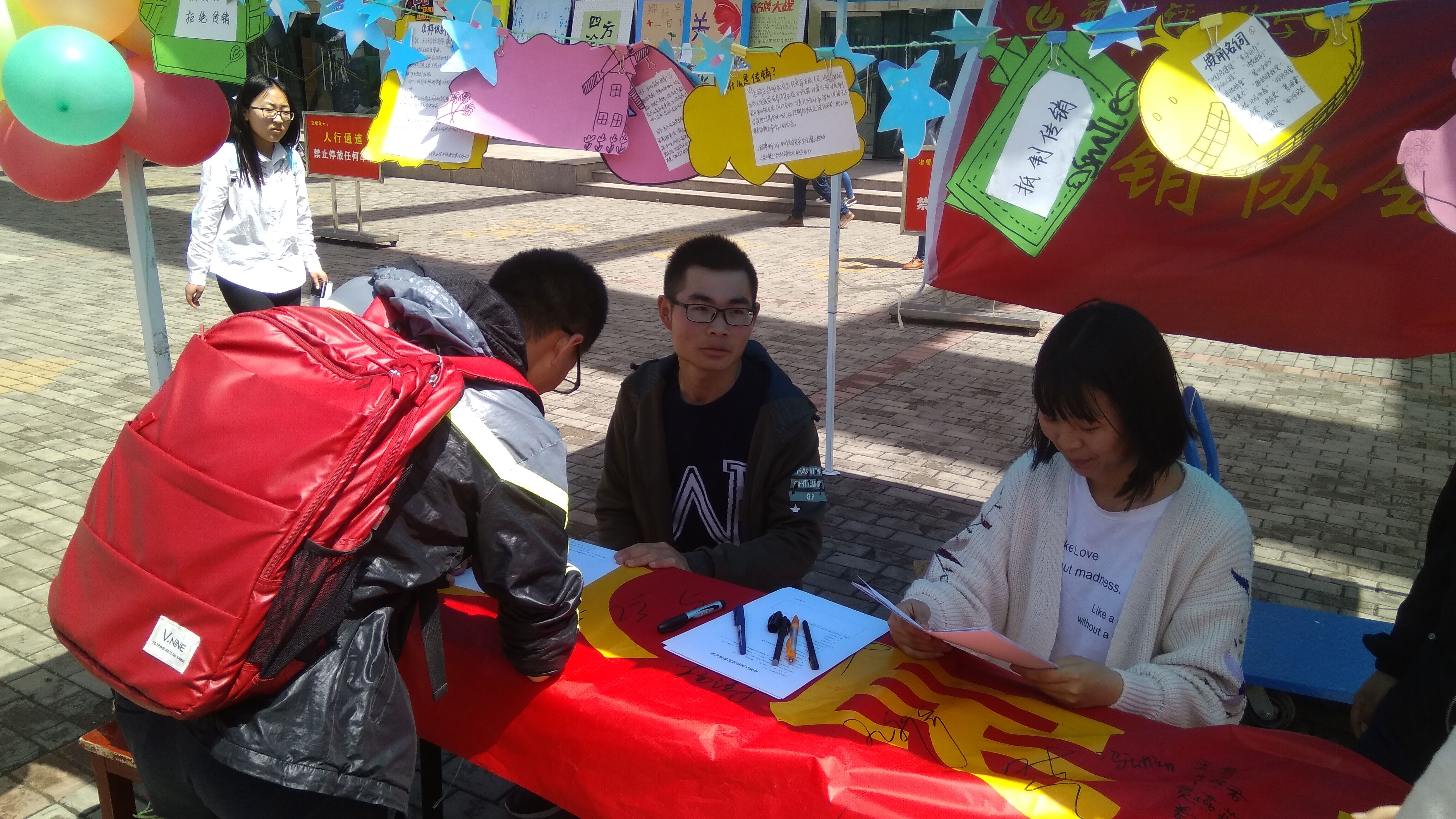 面对传销无孔不入的态势,一些不法分子打着“电子商务”、“投资基金”等新概念的旗号,用高额回报引诱人们投资。这些新型传销骗局对涉世不深,法制观念淡薄的大学生虎视眈眈。对于大学生来说,社会经验不足,容易轻信他人,很容易落入传销组织。落入传销组织,对自己,对家人,对社会,都将会带来很大的伤害,无法估量。为增强大学生的安全意识,避免大学生落入传销魔掌。4月17日上午,由大学生社团联合会主办,营销协会承办的大学生反传销安全教育活动,在科学校区清苑餐厅及学校主干道成功举办。到场人员有营销协会15级干部和16级人员。