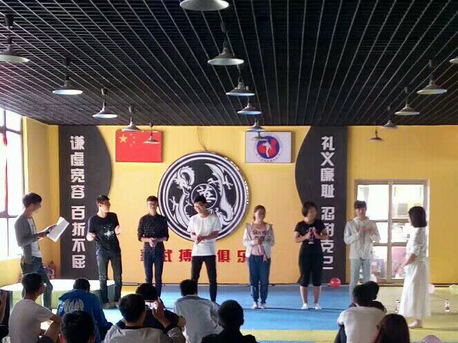 首先,会议以一首动听的吉他音乐开场,接着由主持人杨粤薇和杨兰介绍各位参会来宾并欢迎17级新生加入武术协会。随后由现任会长林静上台致辞,他再次表达了对到场来宾的欢迎和感谢,并表达了自己对17级新生寄予的厚望,希望他们能够在武术协会大家庭一起学习,紧接着由副会长仝志浩对新生制定的大学规划进行了简单的询问,并表示无论在生活、学习、还是感情上有问题都可以向他请教,现场响起了雷鸣般的掌声。之后由副书记介绍协会历史以及成员孙瑾瑾带来的表演吉他伴唱《小幸运》,期间与会成员们不约而同的跟着节奏唱了起来,会议进入一个高潮阶段,动听的音乐落下了最后一个音符,接着是游戏环节“金龙拍拍操”,协会新老成员一块上台,增进了彼此之间的关系,动脑动手的游戏结束后,由买仁萍和刘永鹏分别表演了心意六合拳和太极拳,这也体现了武术协会以武会友的精神,新生看的热血澎湃。然后到了最激动人心的抢红包环节,整个会场再次热闹起来,成员们纷纷拿起手机,期待自己是那唯一的一个运气王,紧张刺激的抢红包环节结束之后,由总教练买仁萍对武术协会的训练项目做了介绍,并希望新成员们能够坚持下去,因为坚持是成为高手的重要条件。见面会进行到最后,主持人宣布此次见面会圆满成功。