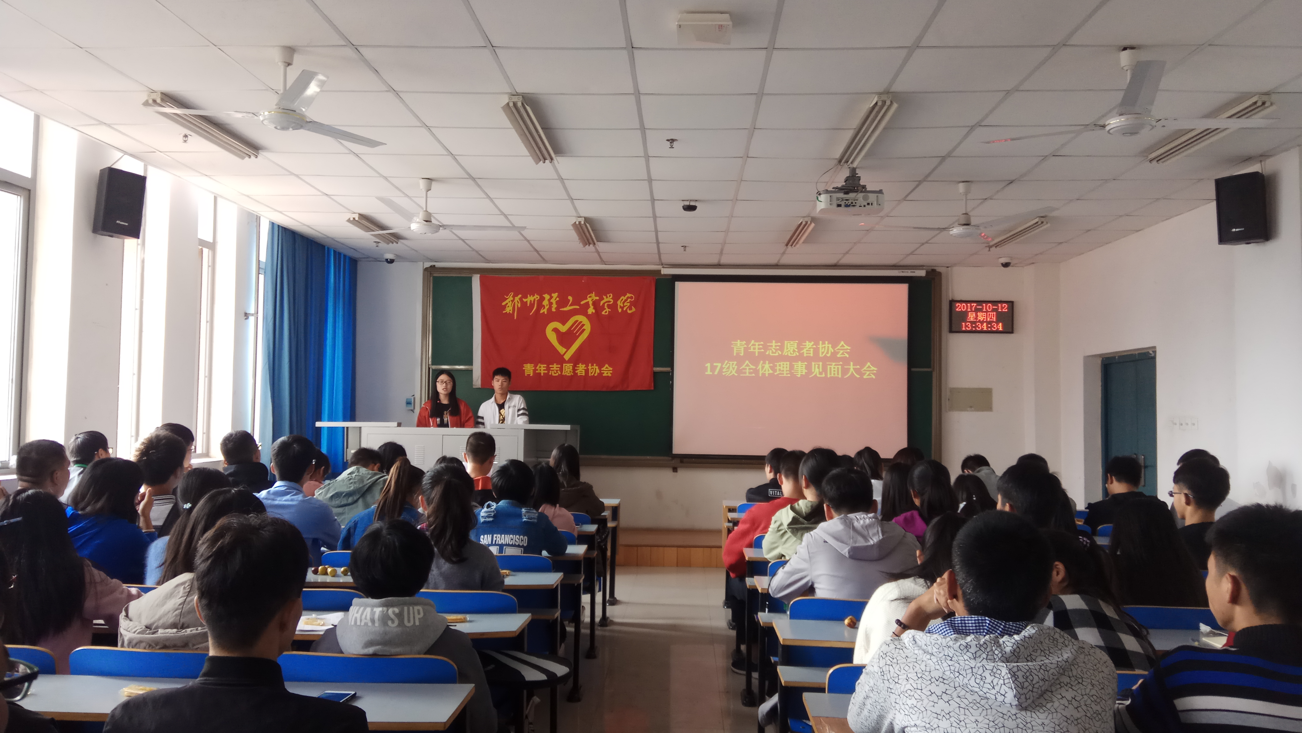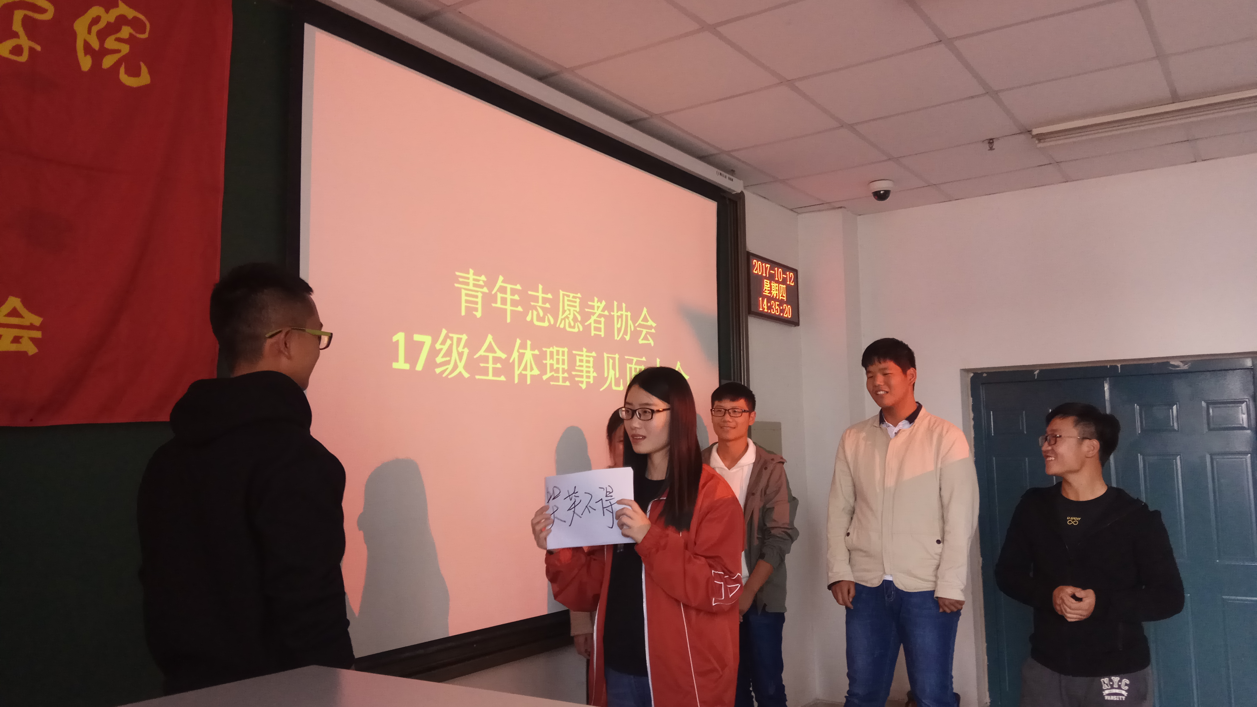 为了促进协会成员之间的交流,增进17级成员对协会各个部门的认识和了解,增强协会的凝聚力和向心力,由大学生社团联合会主办、青年志愿者协会承办的全体理事大会于10月12日下午2点在科学校区第二教学楼710室顺利举行。出席此次会议的有书记谢诗宇、会长谷波、副书记王博士,秘书长王宁,16级各个部门的副部长以及17级全体理事成员。