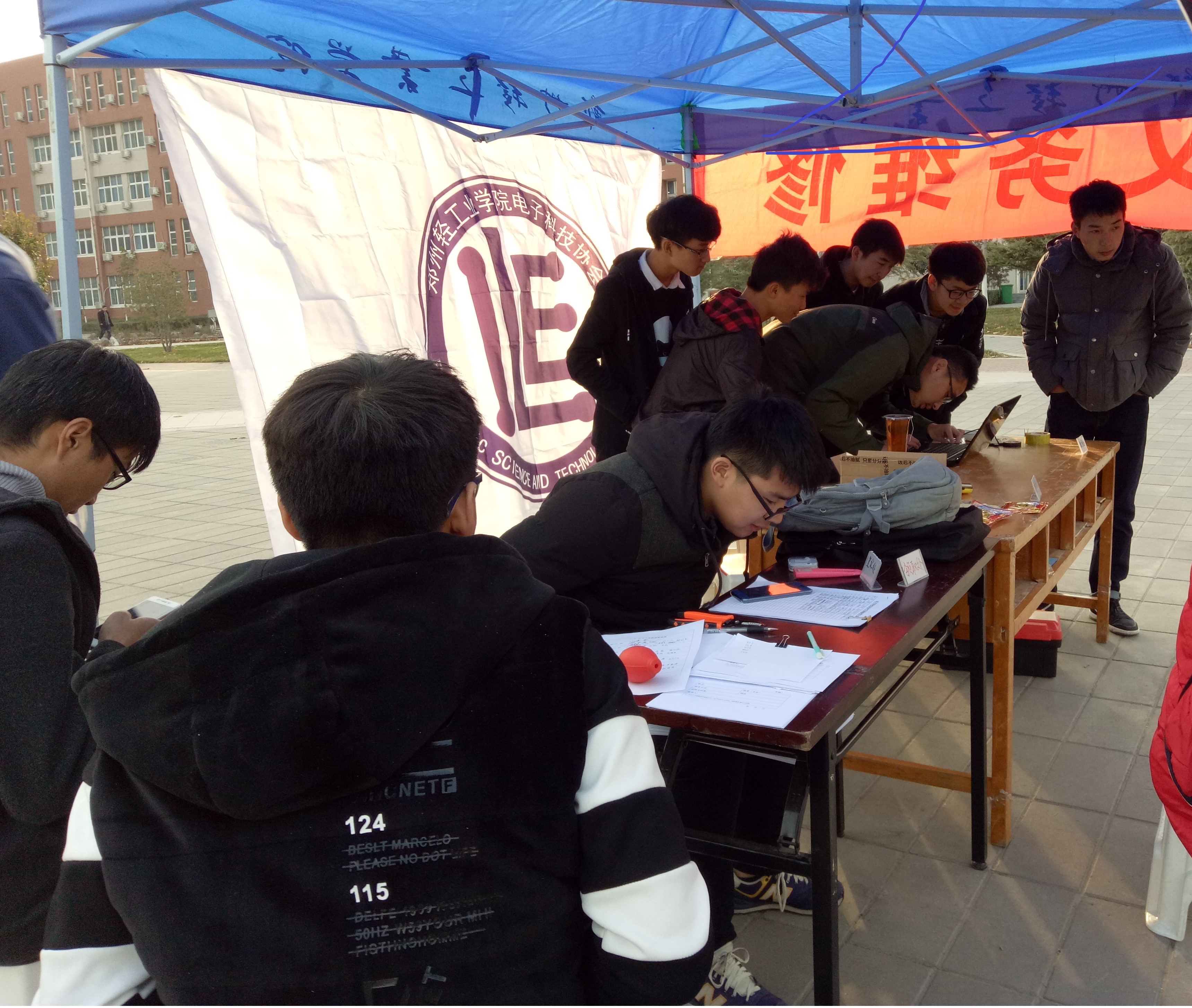 早上7点30分,电子科技协会的成员将桌子、椅子、帐篷等物品搬至活动地点,整理完毕后于八点正式开始义务维修活动。电子科技协会各部门成员依次在活动地点值班。活动开展不久就有不少同学和学校周边居民带上他们出现问题的电子产品前来求助,包括电脑、手机、飞机模型等。在对前来寻求帮助的人进行登记后,电子科技协会的成员开始对这些电子产品进行维修。维修期间,电子科技协会会长彭俊瑜给协会成员送来热水,关心协会的工作人员。协会成员分工明确,登记、维修都进行得有条不紊。对于前来寻求帮助的同学提出的问题,协会成员也都一一耐心回答。对于那些问题比较复杂的电子产品,在征得其主人同意后工作人员将这些电子产品带到电子科技协会办公室工程训练中心321进行维修。下午五点,本次活动圆满结束。