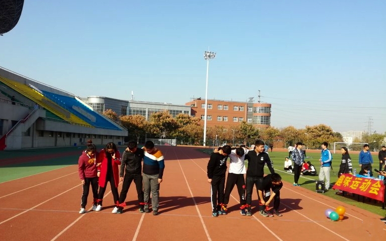 活动伊始,主持人查文晨向参与活动的人员介绍了参与本次活动的各位嘉宾,接着介绍了本次趣味运动会的流程及各个项目的具体规则。本次活动以比赛闯关为主,共设六个比赛项目。第一个环节是绑腿跑,四人五足,一百米的距离看似不远,但跑起来却是那么不易,场上参赛者跑得紧张,场下观众看得更紧张。接下第二个环节是先原地转五圈,然后两个人背对背夹气球移送50米,中途气球不得掉地,不得挤破。看见他们晃来晃去向前移的样子,场外观众都忍俊不禁。第三个环节让参赛选手用嘴刁杯子,轮流将一杯杯装有半杯水的杯子送至下一个赛点,直至记录最后桶里的的水位达到标准线。第四个环节,劈叉接力,先到终点组进行下一项。随着第五个环节搭火车,四名组员站成一列,后一名组员的右手抓住前一名组员的右脚,左手抓住左肩,四人一起单脚跳至第六个环节处,最后大家一起冲刺跑至终点,即为完成比赛。比赛过程中赛场充满了笑声欢呼声,观众们为正在比赛的同学们加油助威。待所有参赛组都比赛结束后,由主裁判宣布成绩并为前三名颁发奖品。最后,在成员们合影时的欢呼声中本次趣味运动会落下帷幕。