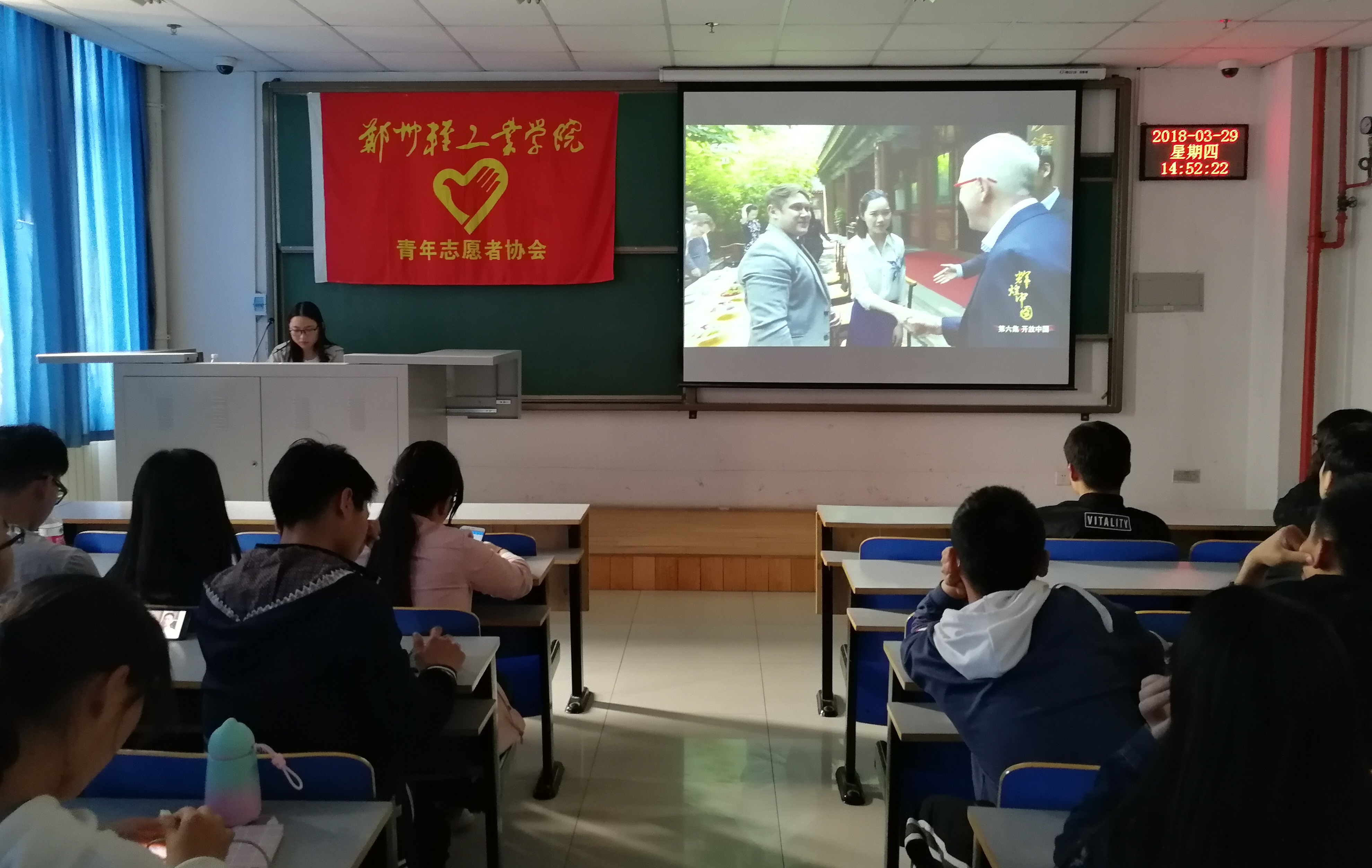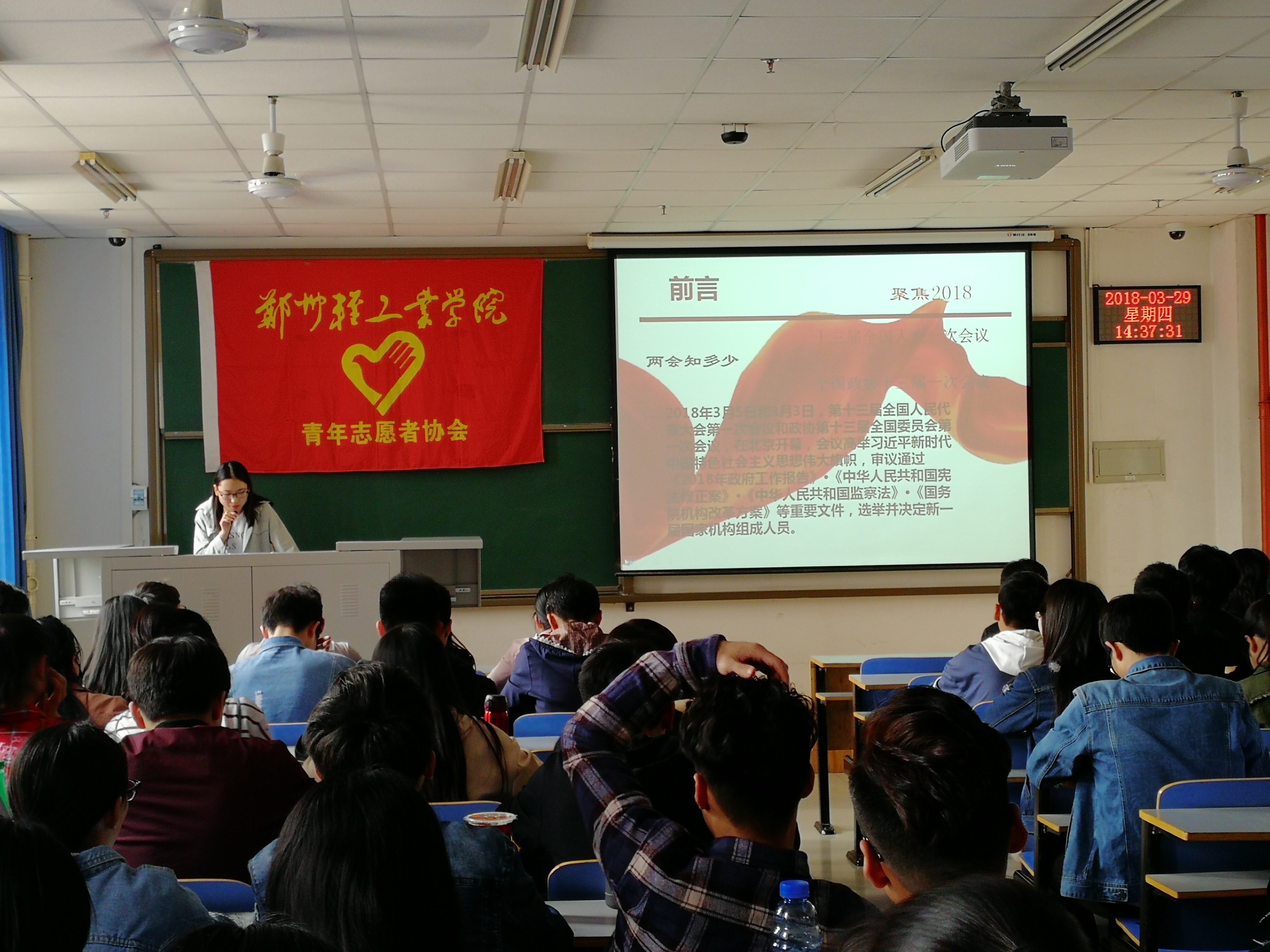 “奋进新时代,筑梦新征程”。为增进志愿者们对两会的认识和了解,提高思想意识觉悟,使志愿者在志愿活动过程中能够更好的与时代要求相符合;3月29日14:30,由青年志愿者协会主办的以“学习两会精神,明鉴青年之志”为主题的团日活动在二教楼708室顺利举行。出席此次活动的成员有书记谢诗宇,会长谷波,副书记王博士,秘书长王宁,各部门副部及全体理事。本次活动由文艺部副部张莎莎主持。