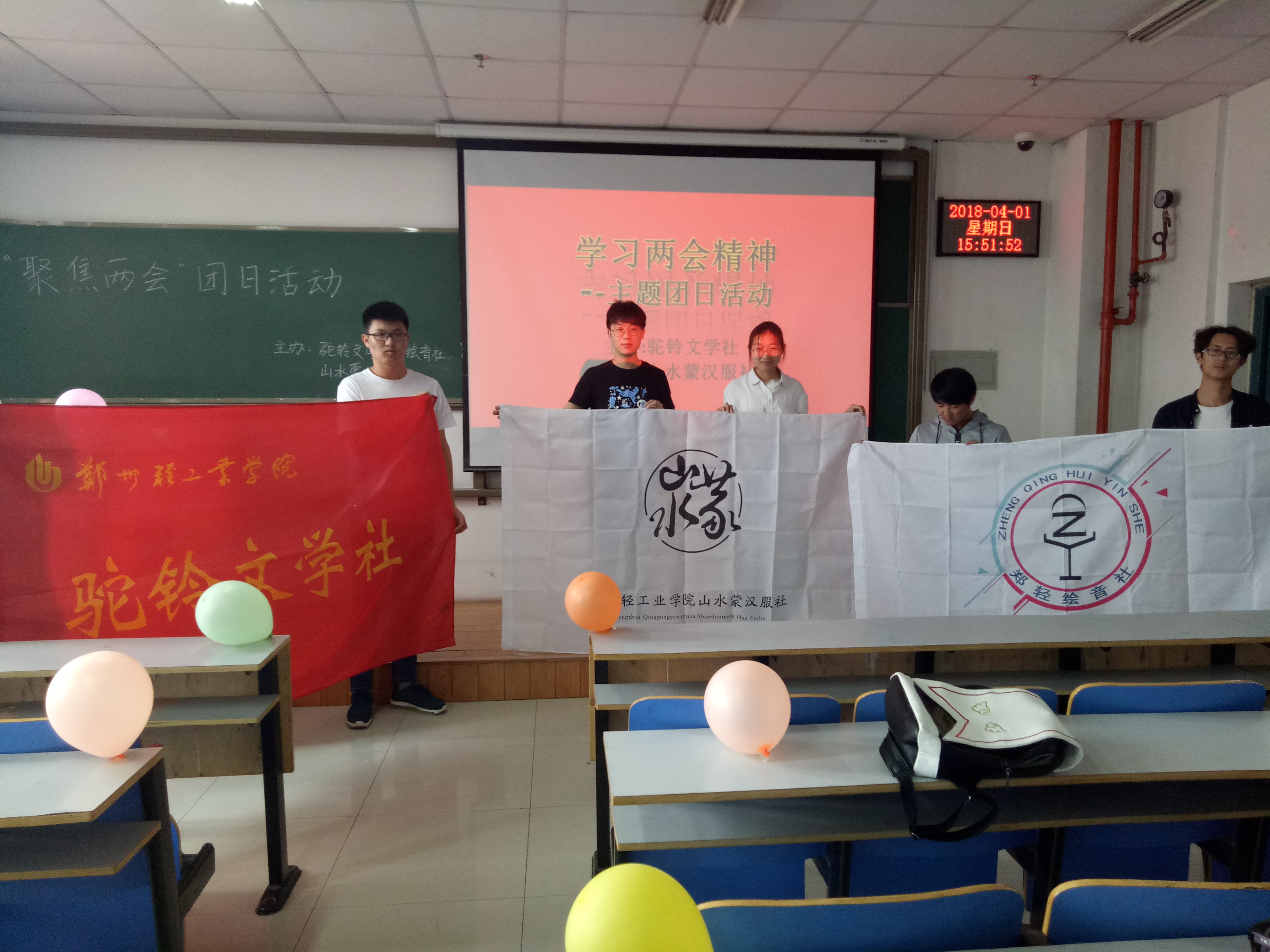 4月1日,由驼铃文学社、山水蒙汉服社以及绘音社主办的“两会”精神团日活动在科学校区第二教学楼708室成功举办,参与本次活动的有驼铃文学社社长张淼,山水蒙汉服社社长贺静,绘音社社长王丽鸽、书记令狐广安以及各社团17级部分成员。本次活动由绘音社培训部部长郭卫重主持进行。