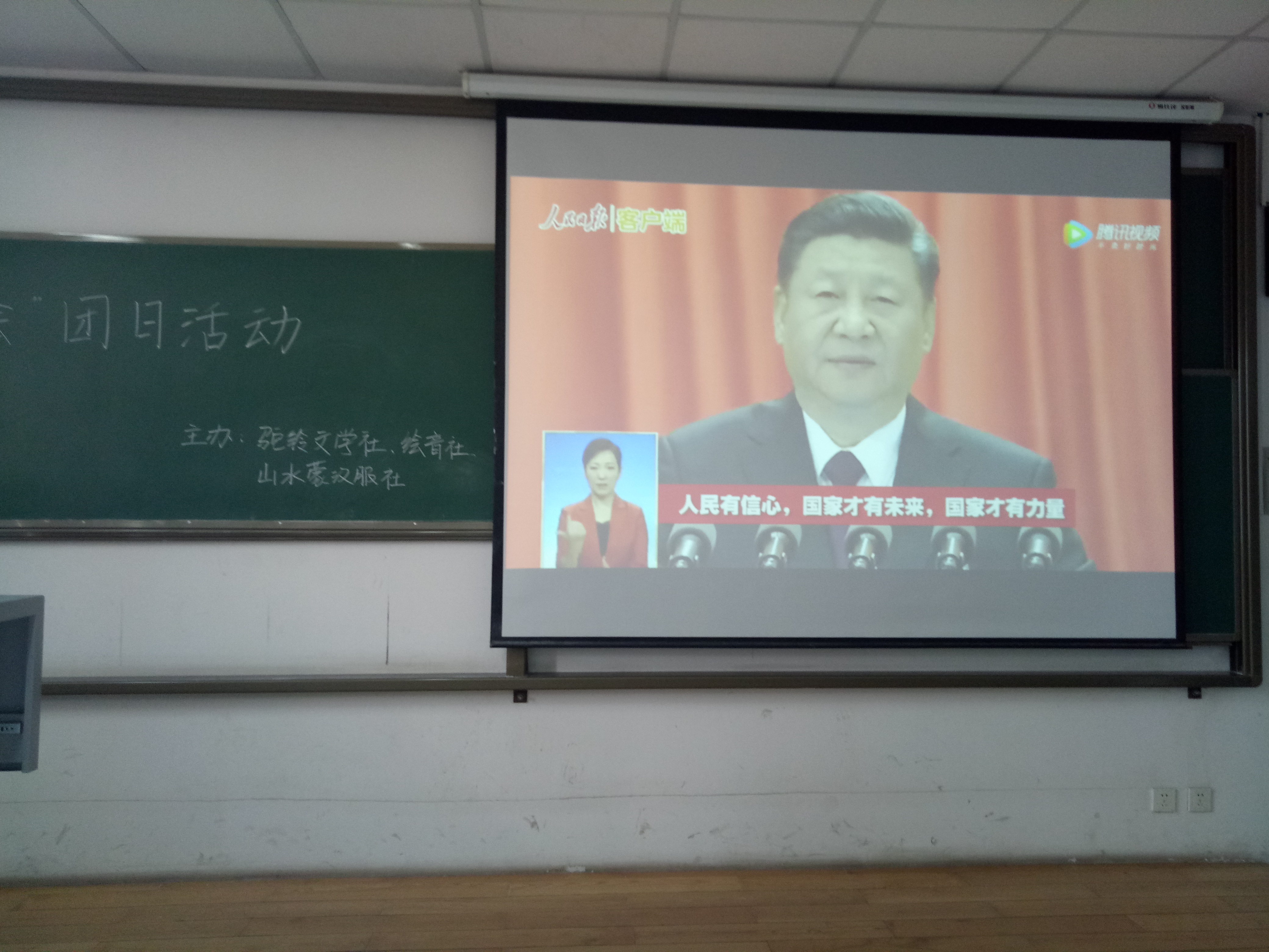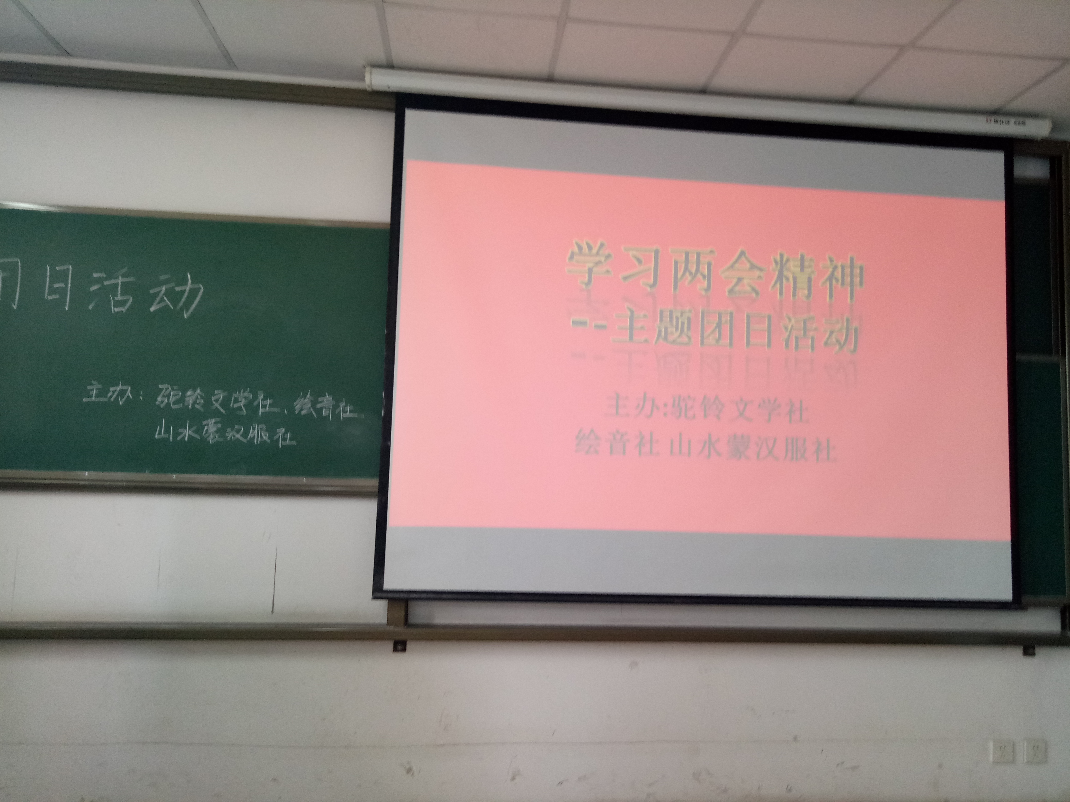 4月1日15时,驼铃文学社社长张淼对活动场地进行了精心布置,在参与人员到齐之后,绘音社社长王丽鸽组织到场人员签到,签到结束后,活动准时开始。首先是主持人郭卫重对本次活动做了简要介绍,强调了本次团日活动的重点:学习“两会”精神,享受大学生活;紧接着,汉服社社长贺静上台放映了以学习“两会”精神为主题的PPT,向观众详细介绍了“两会”的会议内容及精神,在此过程中,观众细细聆听之余还对部分概念进行了讨论,更有观众毛遂自荐解读PPT中的内容;然后,绘音社社长王丽鸽上台放映了以“两会”金句为主题的短片,短片中,习近平主席提出的诸如“要幸福就要奋斗”、“山再高,往上攀,总能登顶”以及“时间不等人,容不得有半点懈怠”等金句令现场观众似有所思;最后,主持人对本次活动进行了总结并感谢参加本次活动的成员。