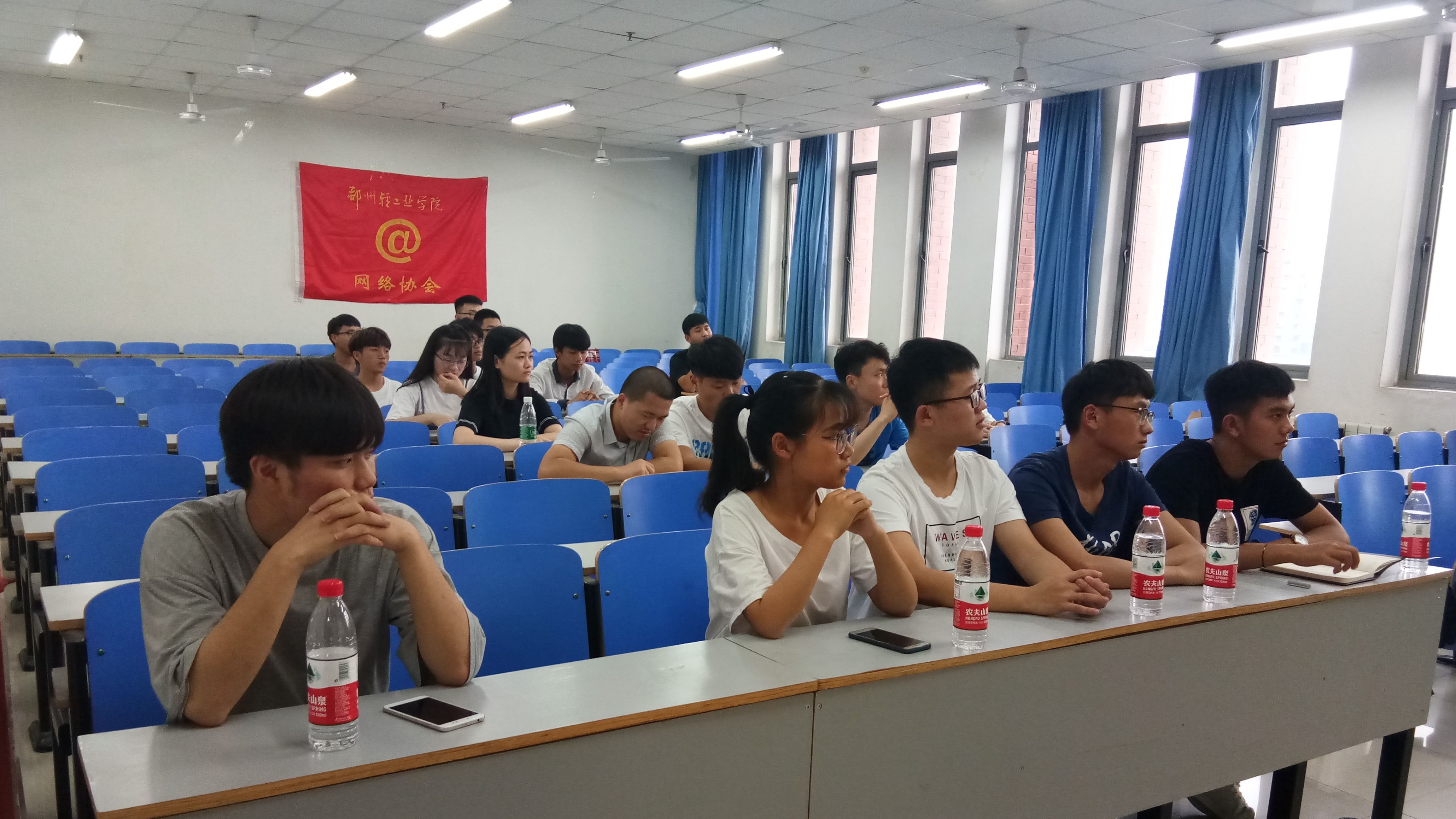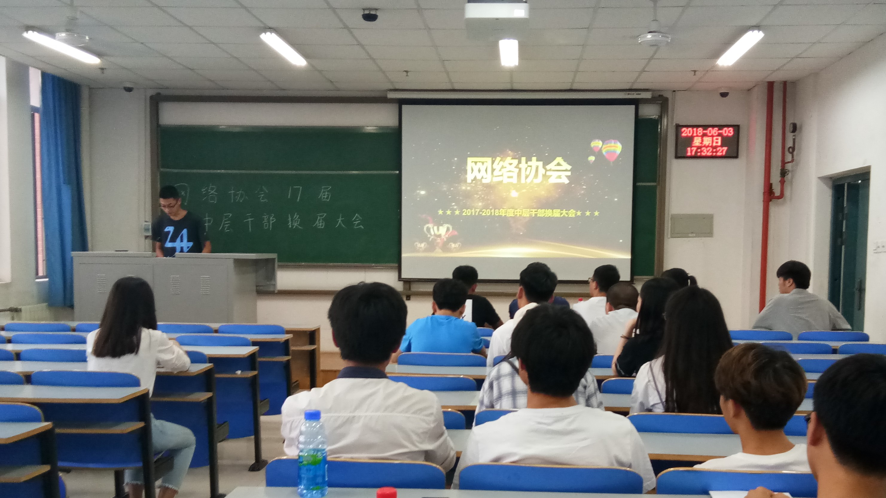 6月3日下午由大学生社团联合会主办,郑州轻工业学院网络协会承办的网络协会中层干部换届大会在二教708举行。参加本次大会的人员有网络协会副会长姚松茂,副书记王萍原,技术部副部长田昊、侯泽翔,外联部副部长曹天瑞,组织部副部长黄甜,宣传部副部长杜浩楠、王宇,秘书部副部长徐明慧以及17级骨干干事。本次会议邀请嘉宾有英语沙龙协会会长武守稳,电子科技协会秘书长刘瑞,交谊舞协会会长田寅,环保协会副会长副会长江千峰,演讲与口才协会网宣部部长张文杰。由秘书部副部长徐明慧担任本次大会的主持人。
