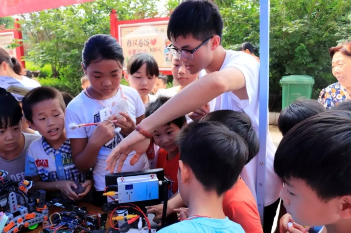 “大手拉小手 科普助成长”科技知识普脱贫攻坚教育关爱志愿服务关爱团来到了荥阳市聂楼社区,开展了一场让孩子们快乐,让志愿服务队欣慰的志愿活动。帐篷搭好后,队员们便把机器人早早的摆了出来,小朋友们都按捺不住心中的激动,一个个都跑来询问,一张张充满好奇的脸上洋溢着纯天然的开心。面对着这群有着如此浓厚兴趣的同学,队员们都耐心的回答小朋友的问题,并且以幽默的方式给他们普及了机器人方面的很多知识,小朋友们都在认真听讲着,不难看出,他们对科技方面的求知欲并不低于成年人。家长们也跟随着孩子们来到服务台前,看着这些新奇的东西,得知又是同学们自己做的,像小分队成员们竖起了大拇指。队员们的脸上也洋溢着幸福的笑容。社区外的机器人展示完毕后,小分队成员们来到了社区文化中心,集中的向孩子们讲解并且更加详细的阐述了机器人等方面的知识和相关原理,并且在现场对机器人进行了展示。无论是长着六只脚的蜘蛛机器人还是能够跳舞的跳舞机器人,总是能够引起孩子们的阵阵欢呼声讲解的过程中,队员们还和小朋友的来了一场深切的互动,小朋友的参与性真的很高,活动结束,队员们对表现优异的小朋友发放了小的礼品来奖励一下。