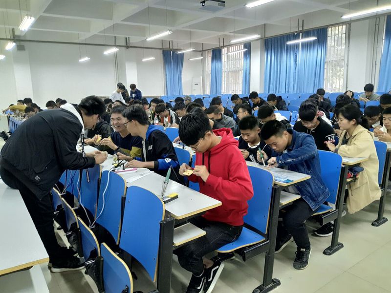 活动开始之前,参加活动的同学们陆陆续续到场并由组织部负责签到,签到完毕后,同学们有序的领取电烙铁。大家依次领取电烙铁并坐好之后,本次焊接培训正式开始。本次培训由16级会长刘天佼主持,分别从“什么是电烙铁、电烙铁的基本使用发法、元器件的认识、焊接电路图”四个方面详细介绍了电烙铁的使用方法以及焊接的注意事项。在场的同学们积极听讲并认真学习。主持人介绍完毕后,由现场的工作人员给在场同学们发放焊接元器件以及洞洞板。元器件发放齐全后是同学们的动手操作时间。经过学习后,同学们纷纷专注于自己手上的元器件,认真的排好属于自己的电路并进行焊接。当同学们遇到不懂的地方时,同学们积极提问,由在场的16、17级成员耐心解答并告诉他们相关的注意事项。在认真操作之后,同学们都完成了属于自己的成品。怀着一份激动之情,同学们带着自己的成品让协会16、17级成员检查是否焊接成功。在改进之后,同学们成功的完成了电路的焊接。