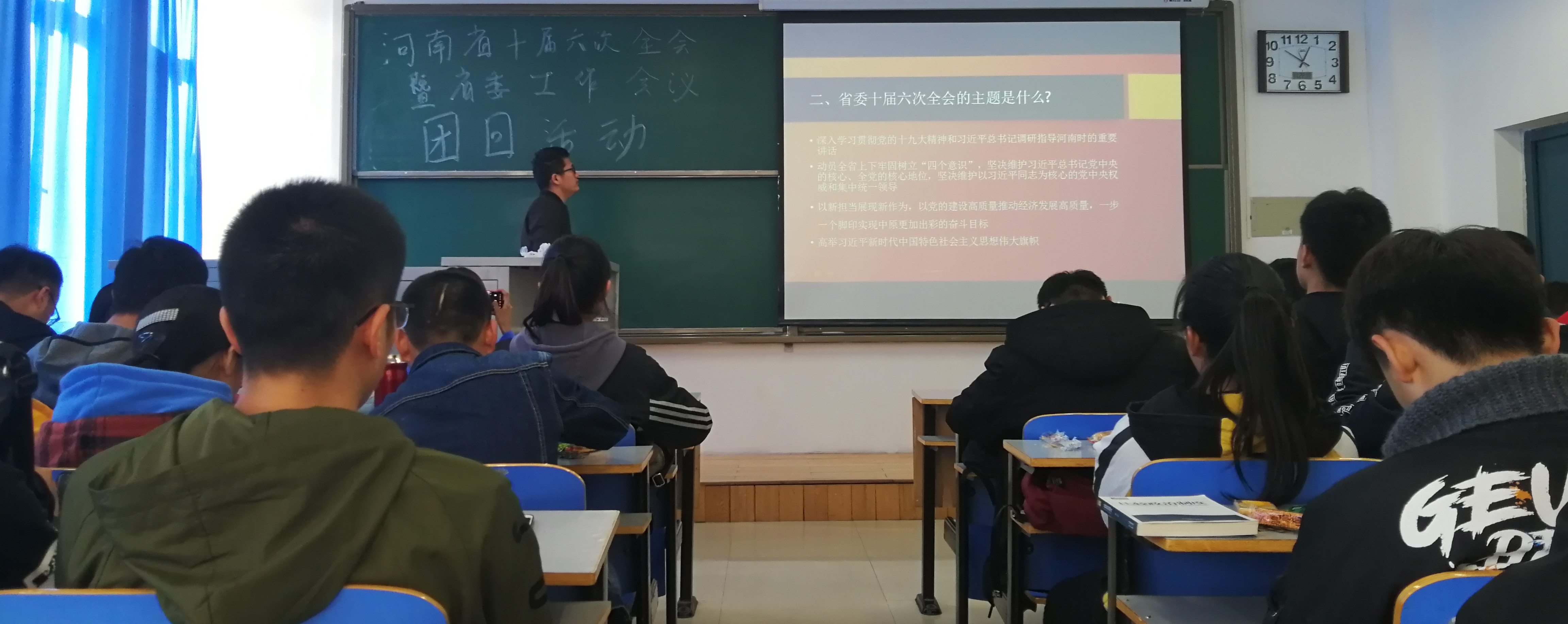 为了让同学们更好的了解十届六次全会暨省委工作会议的内容,增强同学们的爱国爱党意识,学习共产党的优良精神,11月22日中午,由羽毛球协会,足球协会,棋类协会联合举办的团日活动,在科学校区二教楼710教室举行。本次活动由棋类协会的马召峰主持,参加本次活动的嘉宾有羽毛球协会书记施仁旭,棋类协会副书记马召峰,足球协会宣传部副部长欧阳少峰以及各协会负责人和18级新生。