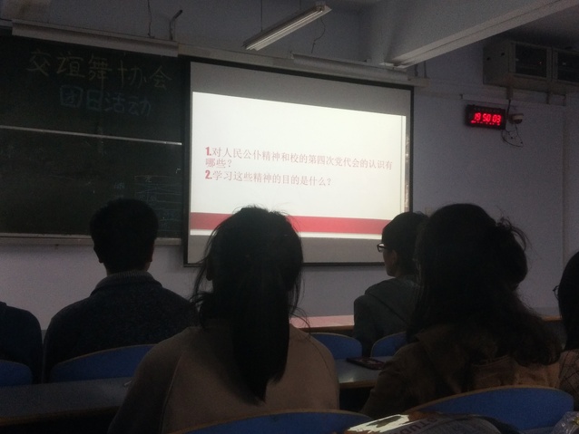 2018年11月21日,郑州轻工业学院交谊舞协会在西五楼301举办团日活动――学习校第四次党代会精神。本次活动副会长苏渤恒,副书记谢宇婷组织召开,同时到会的还有各部门负责人及各位新生们。
