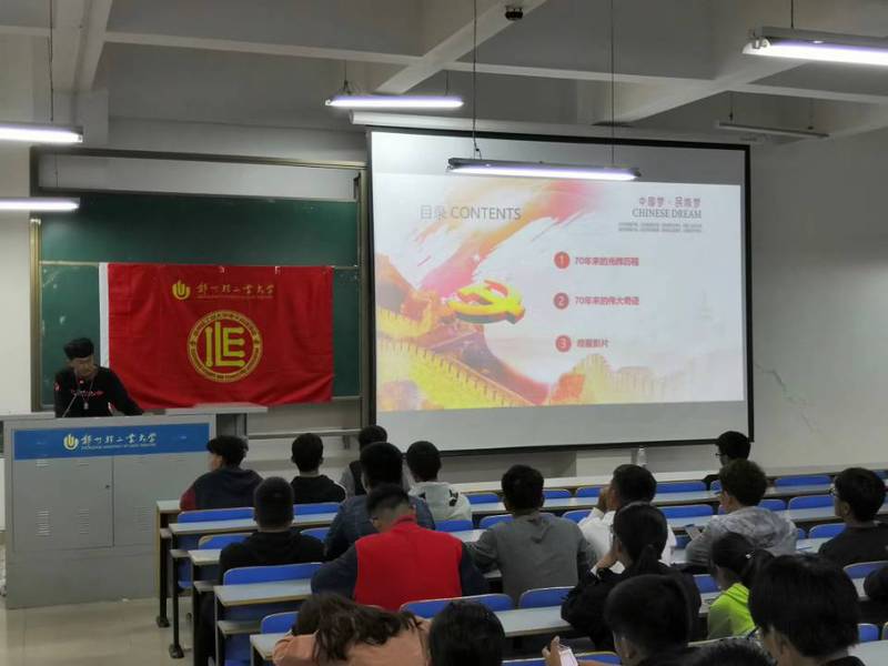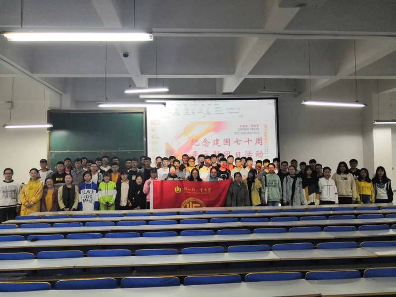 活动开始之前,参加会议的同学到场完成签到后有序落座,会议第一部分为主持人范俊涛介绍本次活动的主题“庆祝祖国七十华诞”,目的是为了增强同学们的爱国主义精神,增强凝聚力、民族认同感。会议第二部分由主持人讲解建国七十周年来中国在经济、制度、科技、民生、社会基础建设、文明建设等多个方面上的巨变,并有同学积极发言表达自己的亲身体会和对各方面的了解,并且对国家发展的美好前景作出了期盼。会议第三部分为观看爱国主义视频,第一条视频为开国大典彩色影片,第二条视频为中国近代史剪辑,观看过影片后同学们情绪激动,为和平的来之不易而感慨万分,达到了本次活动的目的,也将本次会议推向了高潮。会议第四部分为会长雷永溁进行寄语,对同学进行了爱国主义思想教育、及现代大学生学习目标规划的指导。会后工作人员派发礼品,全体成员合影留念,最后同学们有序离场。