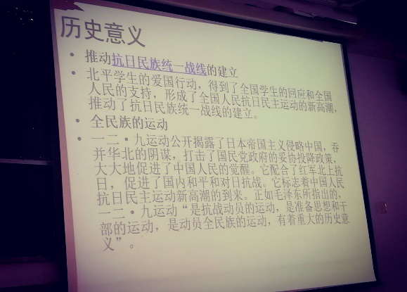 本次活动以观影形式及ppt讲解进行,组织者为同学们播放了爱国影片。观看完毕后,同学们纷纷表示:要永远铭记12.9这个神圣而又伟大的日子,勿忘国耻,永远不忘日本对中华民族的侵略,永远记住落后就要挨打的血的教训。爱国是我们每一个中国人都肩负的责任,不忘历史,激励自己,警醒后人,是我们该有的行动。用行动爱国,努力工作,认真做人,心系国魂。