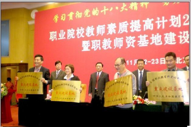 2012年11月22日—23日,教育部在北京组织召开全国职业院校教师素质提高计划2012年度工作会议暨职教师资基地建设工作会议,传达全国教师工作会议精神,总结交流职业院校教师素质提高计划2011年度项目执行情况,部署安排2012年度培训工作任务,并为新批准的33个全国重点建设职教师资培训基地授牌。教育部副部长刘利民,教育部教师工作司司长许涛出席会议并讲话。来自全国各地的101个全国重点建设职教师资培训基地单位的主管校长和基地负责人共300余人参加了会议。我校作为新获批的全国重点建设职教师资培训基地,赵继红副校长等一行三人参加会议并上台接受了授牌。