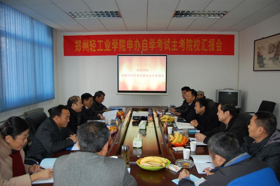 2012年12月7日,以河南省招办自学考试处张治彦副处长为组长的专家组一行三人莅临我校,就我校申办自学考试主考院校事宜进行现场论证。安士伟副校长出席论证汇报会并讲话。第三党总支、继续教育学院、合作办学管理处以及相关院系负责人参加了论证会,河南省工业设计学校刘诚副校长、河南省工艺美术学校吴涛副校长作为特邀专家参加论证会。论证会由河南省招办自学考试处张治彦副处长主持。