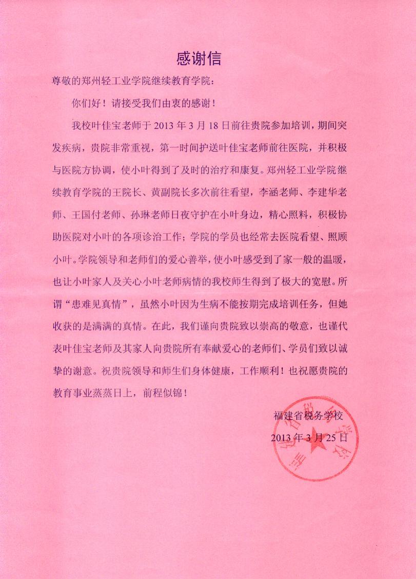在得到叶佳宝生病的消息后,福建省税务学校的领导不断来电询问病情,并委派副校长张桂来和校长助理姚华凡于3月27日上午专程来到我校,感谢国培基地办公室领导和老师对学员叶佳宝的真诚关怀和悉心照顾,并送来了热情洋溢的感谢信。