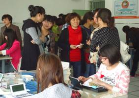 4月23日中午,2012中职骨干教师国家级培训会计电算化班学员在辅导员孙琳的带领下来到郑州市财贸学校,考察在这里举行的“郑州市中职学校营销实战大赛”。郑州市职业教研室专业教学部李主任热情接待了学员们,向大家详细介绍了比赛设置情况,并将近年来郑州市历届中职学校营销实战比赛的具体方案赠送给学员们进行交流。随后,学员们深入比赛现场,到各学校参赛选手设置的模拟营销展台前参观,与参赛同学们进行了认真的交流,详细询问选手们的营销构思、商品定位以及实际销售情况。通过此次考察参观,大家表示收获颇丰,对自己未来在中职教学与学生实训演练有机结合方面提供了很好的借鉴。