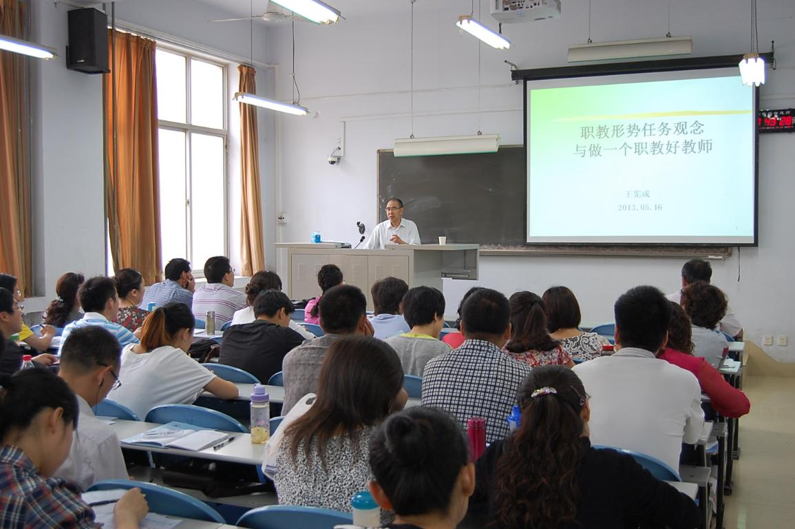 会上,王教授结合自己20多年来从事职教工作的经验,着重从职业教育发展所面临的形势、改革发展的主要任务、现代职业教育的观念及如何做一个好教师进行了深入浅出的论述。他指出,国家对职业教育工作提出了新的要求,经济社会发展对职业教育提出了新的需要,广大人民群众对职业教育提出了新的期盼,我们职业教育教师肩负着光荣而艰巨的历史重任,要坚持以科学发展观为指导,转变观念,开拓创新,争取做一个好教师乃至名师,努力为职业教育发展,为经济发展、社会进步和人民幸福作出应有的贡献。
