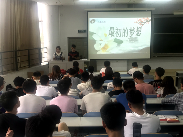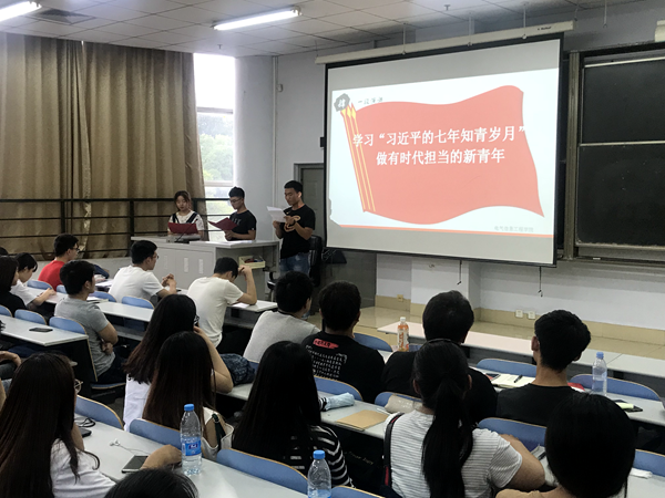 在主持人的指导下,整个流程从唱一首歌开始,大家齐声同唱范玮琪的“最初的梦想”,在音乐的带领下,同学们的心聚在了一起,为接下来的活动营造了良好的氛围。接着,活动进入第二个环节,欣赏一部道德短片,让大家重温了感动中国人物中最美村官秦玥飞服务乡村的故事,再次体会到了那份直击心灵的感动。第三个环节是朗诵一段经典,由程品嘉同学作为代表朗诵《少年中国说》选段,慷慨激昂的诗词朗诵,赢得大家阵阵掌声。第四个环节,张鸿飞同学作了主题为《学习“习近平的七年知青岁月”,做有时代担当的新青年》的演讲。大家了解到了青年时期习近平总书记的艰苦奋斗史,感触颇深。紧接着的是有奖竞答环节,大家踊跃竞答,表现优秀。