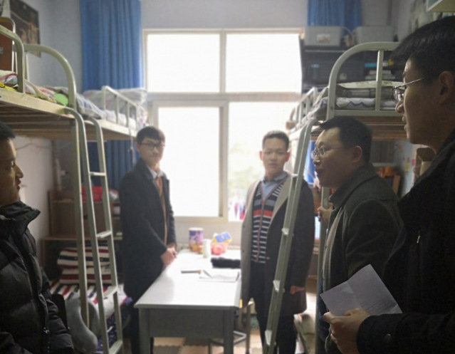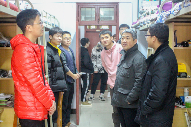 高书记和老师们对宿舍逐一走访,与各年级同学们进行亲切交流,询问学习生活情况,了解同学们在日常生活中的一些问题与目前的学习状态,并对同学们的学习情况提出了建议,高书记鼓励大家要刻苦学习,养成良好生活习惯,营造良好的宿舍环境,注意人身财产安全,用电安全,加强防范意识,在学习和生活上互帮互助,提前做好目标,并为之努力。他叮嘱低年级学生打牢理论基础,尤其要利用好期末考试前的复习时间,为期末考试取得好成绩奠定良好基础,希望高年级的同学确立好考研和就业目标,学好专业知识,培养综合实践能力。高书记强调,全体学生在期末考试中要遵守相关制度和规定,诚信考试。