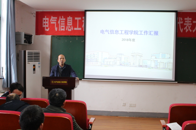 院长王延峰教授向大会做《电气信息工程学院2018年度工作报告》,报告从党建、教学、科研、师资、学科、学生工作、实验室建设等方面总结了2018年学院所取得的成绩,客观分析了存在的不足,并对2019年的工作进行了规划。学院党政办主任耿盛涛老师就《电气信息工程学院2018年度财务收支情况》向与会代表进行了说明。分工会主席宋文军老师向大会做《2018年分工会工作报告》及《2017年分工会会费收支情况的说明》。