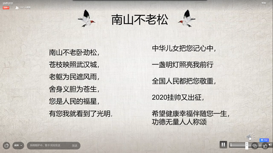 活动开始,主持人向参加活动的同学们点明的此次活动的主要目的,并对接下来的活动流程进行了简要的说明。本次活动设计了六个特色小活动:“分享一个故事”、“朗诵一段经典”、“看一段道德短片”、“知识竞赛”以及“谈一番感悟”、“听一首歌”。活动中主持人分享了钟南山院士无私无畏为人民服务的英雄事迹,以此让同学们感受钟南山院士身上优秀的精神品质,学习他为国为民的精神。曹雷同学声情并茂的朗诵让大家体会到了懂得感恩的温暖,以及榜样的伟大。随后大家一同观看了华为CEO任正非的童年故事,一同回顾了华为崛起的记录片,对此每一个人都感悟颇深。紧接着,到了“知识竞答”环节,同学们踊跃连麦回答问题将直播气氛推向高潮。随后,是由同学代表就本次活动谈自己的感悟,每一位同学都表达出了自己在此次活动中的成长。最终在《南山不老松》温暖而悠扬的曲调之中,活动也渐渐落下帷幕。