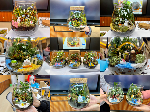 放上营养土、狼尾蕨、罗汉松、网纹草、红点草、各类摆件,随后小心翼翼地覆盖上苔藓,喷洒一点清水。在连绵不断的欢声笑语中,历时一个小时,在老师们指尖灵巧的摆弄下,诸多精致的微景观生态瓶就做好了。