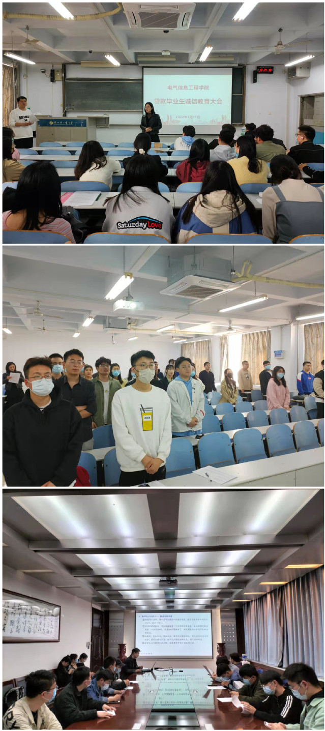 2022年3月11日、15日,电气信息工程学院分别在教三楼402、西二楼301召开高校助学贷款毕业生诚信教育暨诚信宣誓大会。学院党委副书记万慧杰,辅导员刘丰阳老师,2022届贷款毕业生参与。