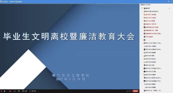 为切实加强毕业生文明离校教育服务,营造浓重热烈、健康和谐、文明有序的毕业离校氛围,近日,电气学院线上召开毕业生文明离校大会,学院党委副书记万慧杰、就业专职辅导员廉琼以及全体2022届毕业生参加。