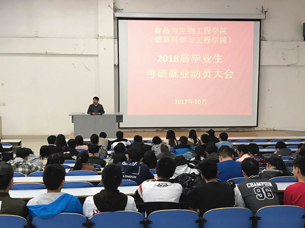 为了使2018届毕业生进一步增强对就业形势的认识,引导应届毕业生科学、合理地完成大学最后一年的学习、生活规划,食品与生物工程学院(烟草科学与工程学院)在三教楼408举行2018届毕业生就业考研动员会。学院党总支吴占超书记、刘延奇副院长、教授博士代表、辅导员老师以及2018届全体毕业生参加此次大会。