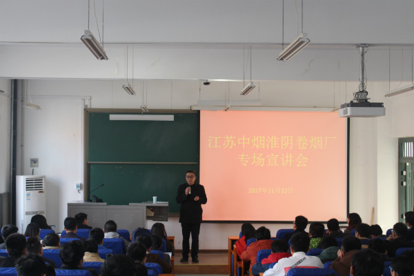 2017年11月22日上午10点,江苏中烟淮阴卷烟厂受食品与生物工程学院邀请在食工楼209举行专场宣讲会。食品与生物工程学院2018届烟草专业毕业生参加了此次宣讲。