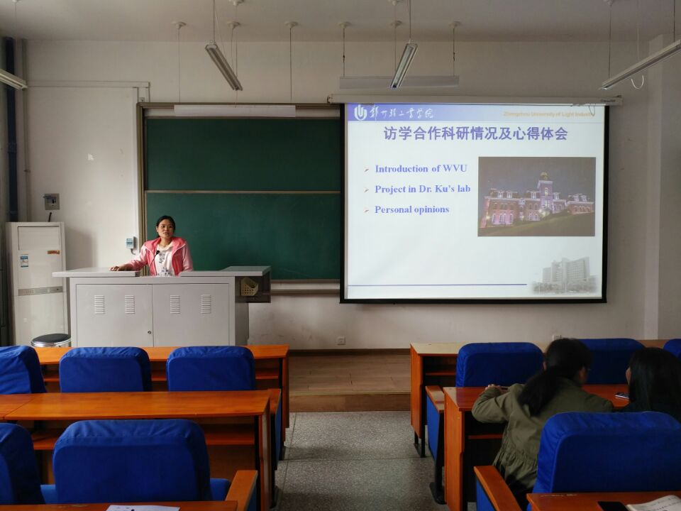张丽华博士主要介绍了自己在美国West Virginia University(WVU)访学期间的合作科研情况和心得体会。首先,她介绍了WVU的校区划分和专业特点;其次,介绍了WVU实验室管理和日常实验的情况,并与国内实验室管理做了简单对比;再次,介绍了自己的合作科研情况;最后,与在场师生分享了自己的心得体会。报告会结束后,又对部分同学提出的问题进行了详细解答。该学术报告对我院师生的出国进修或学习提供了良好的促进作用。