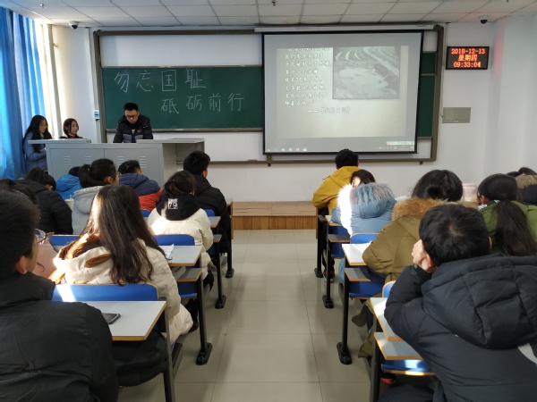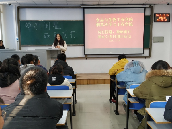 2018年12月13日,是第五个南京大屠杀死难者国家公祭日,为进一步弘扬社会主义核心价值观,激发学生的爱国热情,食品与生物工程学院(烟草科学与工程学院)在科学校区二教楼812开展了以“勿忘国耻,砥砺前行”为主题的团日活动。食品质量与安全18-01班全体学生和我院各班级学生代表参加了此次团日活动。