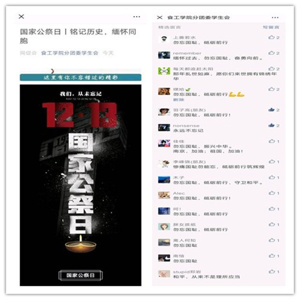 活动伊始,主持人组织观看了国家公祭日的介绍视频,让同学们对公祭日有了初步了解,明白公祭日的含义以及设立公祭日的重大意义。接着,同学们共同端坐静看公祭日祭奠仪式视频,倾听历史,寄托心中哀思,一同悼念南京大屠杀死难者和所有在日本帝国主义侵华战争期间惨遭日本侵略者杀戮的死难者,牢记侵略战争给中国人民乃至世界人民造成的深重灾难。最后,深有感触的同学纷纷抒发自己的感想,表示自己将铭记历史,砥砺前行,在缅怀同胞和先烈的同时,积极推动中华民族伟大复兴的进程。我院也同时开展了线上祭奠活动,同学们积极参与,深切表达哀思之情、奋进之情。