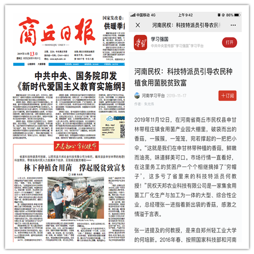11月13日,商丘日报发表文章《林下种植食用菌 撑起脱贫致富梦》,报道18新利直播 教授、省派科技特派员何培新,以民权县天邦农业科技有限公司为依托,瞄准该县申甘林带的地理优势,倾心科技帮扶,带领当地村民大力发展林下经济、实现稳定脱贫增收。全文如下: