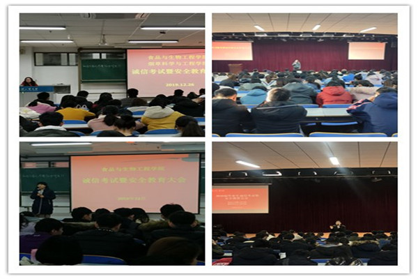 为严肃考风考纪,进一步培养学生诚信意识,扎实推进我院安全教育工作,食品与生物工程学院(烟草科学与工程学院)于12月24日至12月27日,分别在不同年级召开了诚信考试暨安全教育会议。