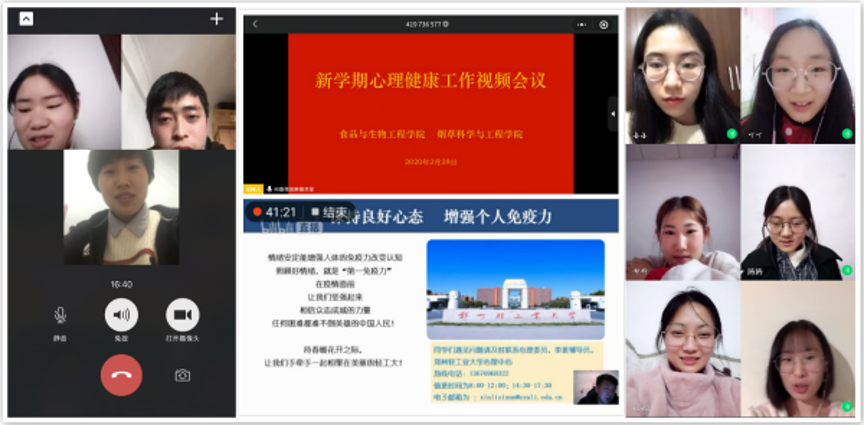 疫情期间,我院多措并行向学生普及疫情防控知识和心理调节方法,了解学生心理需求,科学化疏导,为疫情提供心理防护。一是,心理健康专职辅导员老师通过直播开展线上心理疏导,向同学们宣传疫情心理知识、自我心理调节方法和我校心理中心咨询热线,引导学生理性看待疫情期间的心理变化,学会自我调节,有效预防与减轻疫情所致的心理压力,坚定战胜疫情的信心。二是,我院辅导员开展线上班级视频、语音见面会,及时了解学生的学习、生活和心理状态,关注学生心理需求;通过电话、微信、QQ与学生及时沟通,疏导学生在学业、就业等方面的压力,发挥心理健康辅导作用。三是,召开学院心理信息员新学期心理健康工作视频会议,部署疫情期间心理工作,引导心理信息员强化责任意识,主动担当作为,配合学院做好心理工作,助力同学们保持良好心态。四是,宿舍长组织室友积极参加心理测评,了解疫情心理状态,此外通过定期开展室友视频或语音聊天,在保持良好沟通交流、增进感情的同时,全面了解室友心理状况及需求。