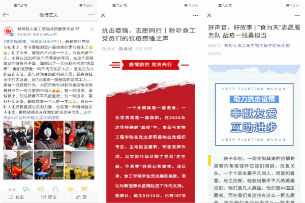 此外,我院充分整理、挖掘典型,通过微信公众平台,创作了“好声音、好故事”抗疫志愿者系列作品,宣传防疫抗疫工作中涌现的先进典型和感人事迹。并结合我院专业特点,推出战疫情|微生物知识科普和战疫“食”事系列推文,传播疫情防控和食品安全知识,引导师生健康生活,科学防疫。
