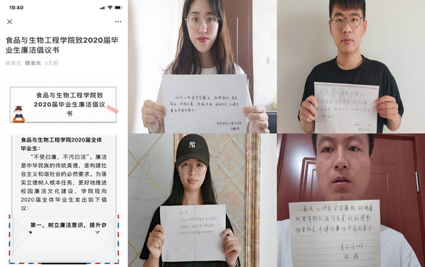 通过学院微信平台“微食光”发布《食品生物与工程学院致2020届毕业生廉洁倡议书》,向全体毕业生发出廉洁诚信倡议,引导毕业生敬廉崇洁、修身立业,以实际行动为母校增光添彩;组织毕业生开展“廉洁从业 从我做起”承诺签名活动,使廉洁从业的理念深入人心。